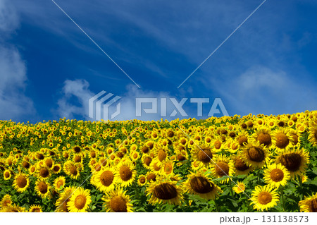 福島縣北方市厚岡町相田北權原守子,覆蓋整個山之倉高原花田斜坡的向日葵田和晴朗的藍天