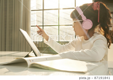 女孩與平板電腦和耳機交談