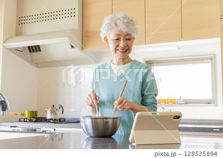 一位老年婦女一邊做飯一邊看平板電腦