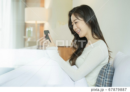 20名韓國女孩躺在床上和手機上