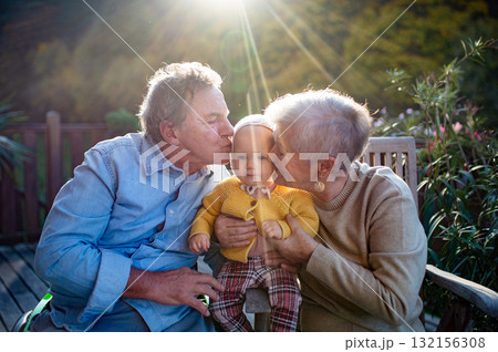grandfather holding granddaughter in arms and kissing her on the cheek
