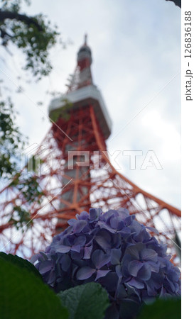 東京鐵塔和色彩繽紛的繡球花