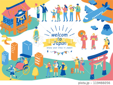 簡單扁平的手繪插畫,描繪了人們想像入境旅行和旅行的情景