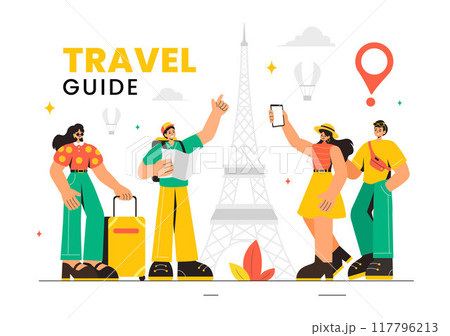 Travel Guide and Tour Vector Illustration Showing Interesting Places to a Group of Tourists for Vacation Planning in a Flat Style Cartoon Background