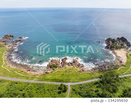 夏季青森縣種佐海岸的鳥瞰圖。