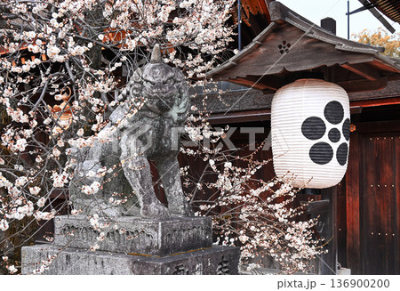 京都北野天滿宮的早春景色,梅園、守護獅和垂枝梅樹盡收眼底。