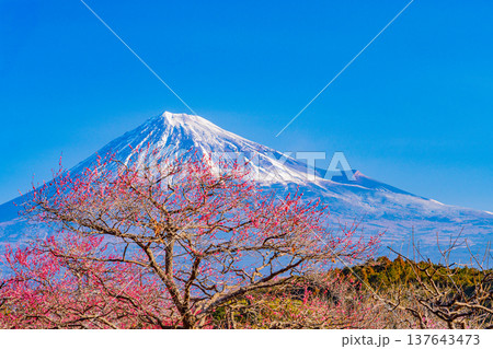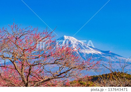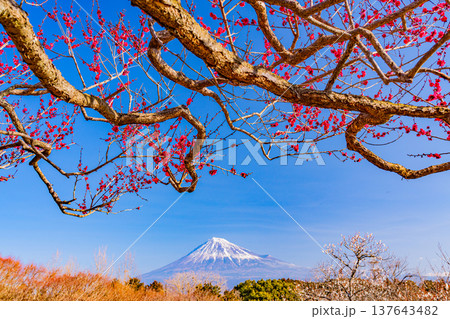 (靜岡縣)白絲自然公園:透過盛開的梅花林眺望富士山。