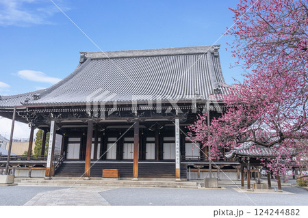 京都,興正寺:盛開著白色和紅色梅花的三門