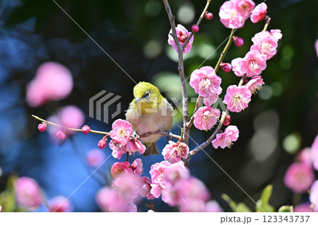 沖繩縣國頭郡本部町本部八重岳櫻花節會場的琉球寒飛櫻花和棲息在南西群島的琉球繡眼鳥
