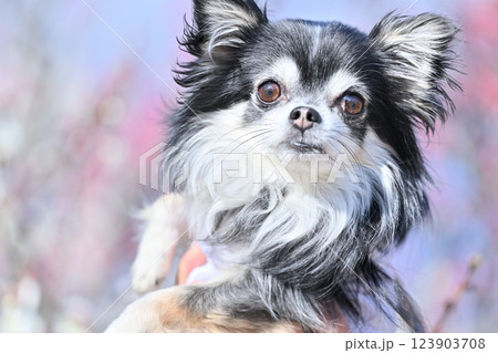 可愛的吉娃娃的肖像,盛開的梅花林,春天的材料