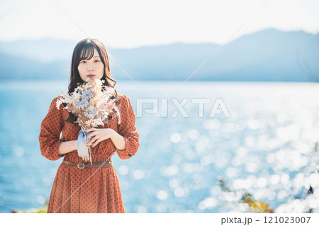 一個穿紅裙子的女人站在湖邊,手裡拿著乾燥花