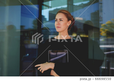 Half length portrait of rich businessman holding portable digital tablet during work break in hallway