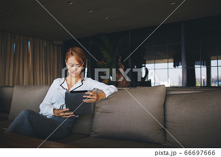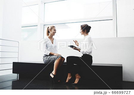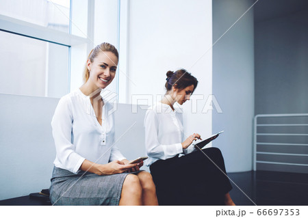 confident women entrepreneurs reading news by using digital tablet and cell telephone