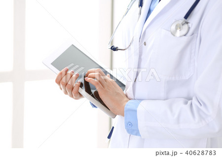 Woman doctor using tablet computer while standing straight in hospital closeup. Healthcare