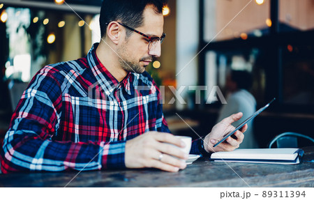 Male blogger dressed in casual shirt installing new application on touch pad device