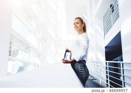 Confident businesswoman dressed in corporate clothes posing in hallway of big company