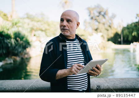 Casual dressed male tourist 60s with digital tablet posing on retirement