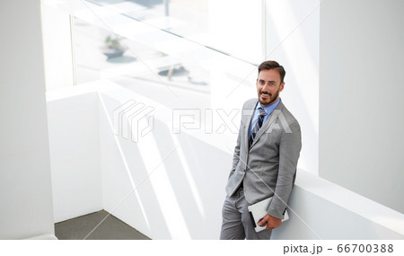 Half length portrait of rich businessman holding portable digital tablet during work break in hallway