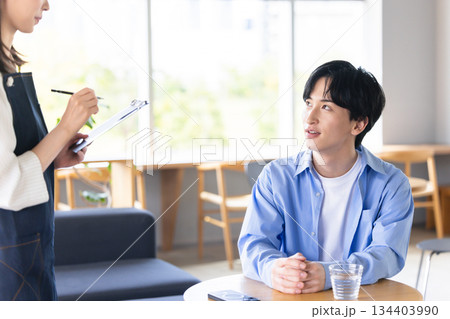 Waiter takes an order from a young couple in restaurant. Cafe worker taking note, writing order. Customer service.