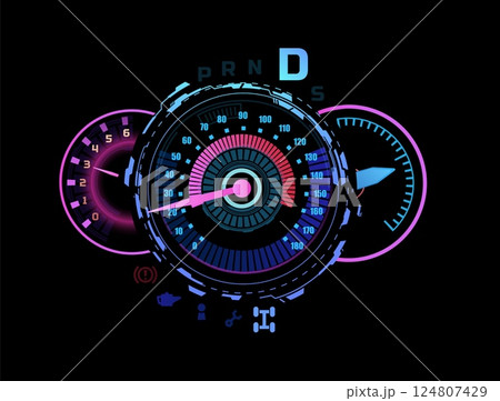 Vector illustration of car speedometer panel in neon blue and pink colors with arrow and dial.