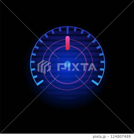 Blue neon speedometer dashboard interface with arrow, vector illustration.