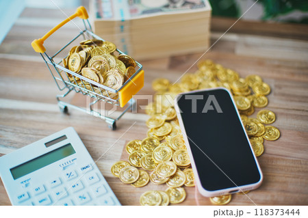 裝滿金幣和智慧型手機的購物車