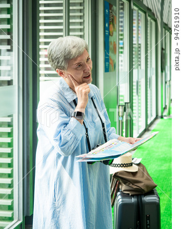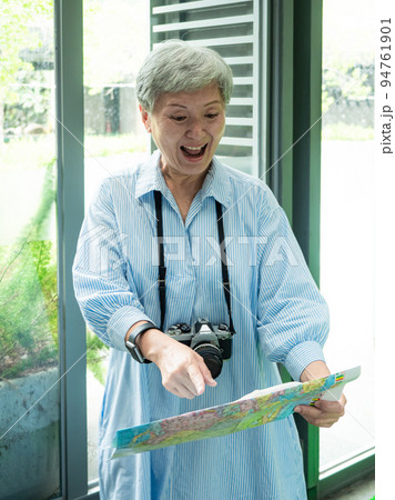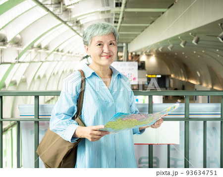 60 多年曆史的成熟亞洲女性肖像、旅行、旅行或旅遊探索概念的手持旅遊目的地地圖。