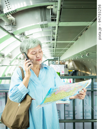 60 歲手持旅遊地圖和智慧型手工機械成熟亞洲女性肖像、旅行、旅行或旅遊探索概念。