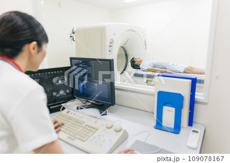 放射科醫生正在進行 CT 掃描。照片由東京電子專門學校電波學園提供。