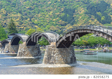 在GW晴朗的天氣裡驅車前往新鮮的綠色岩國錦帶橋,享受清澈的溪流