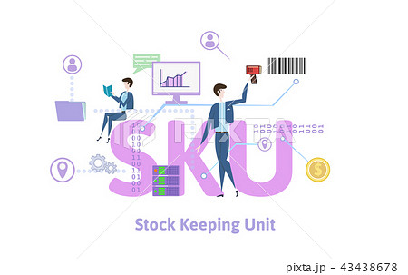 SKU, stock keeping unit. Concept table with keywords, letters and icons. Colored flat vector