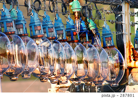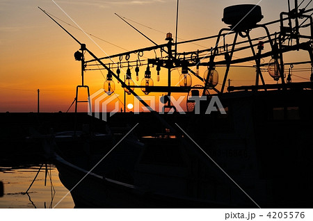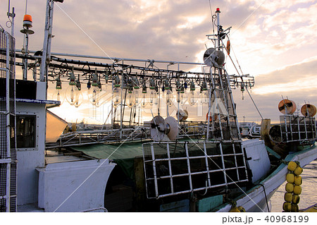 是烏賊漁船坡道和接近黃昏的天空的景色。是傳統的釣魚燈景觀。島根縣
