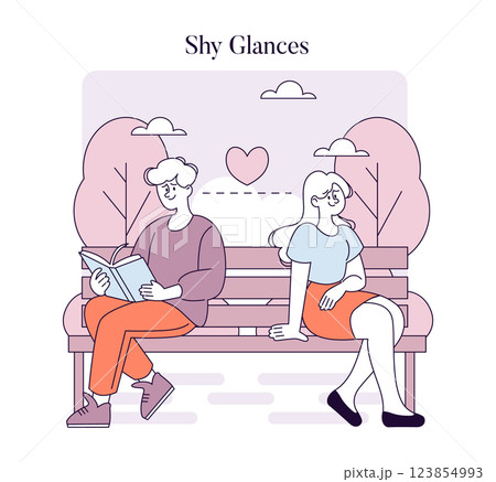 First Love illustration. Captures the tender moment of young romance, showing two individuals on a bench exchanging shy glances. The scene is set in a peaceful park with trees and soft clouds, evoking