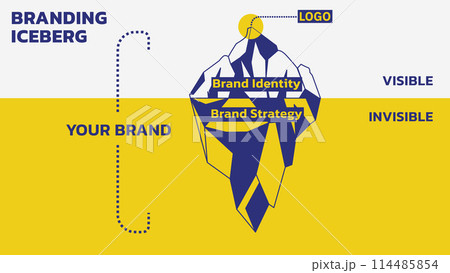 Concept of Brand Iceberg. Brands are Built from the Bottom Up. Invisible is Brand Strategy (Logo and such). Visible is Brand Identity (Offering, Purpose and such). Vector illustration Outline Style.