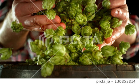 Male hands holding a handful of fresh green hop cones on old wooden barrel. A brewer harvests plants to make craft beer