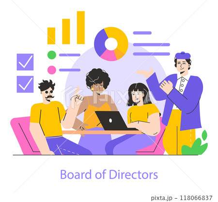 Corporate team meeting illustration. Diverse board of directors analyzing graphs during a business strategy session. Collaboration, leadership, decision-making. Vector illustration.
