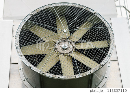 Air ventilator system in large commercial building, Air flow ventilate fan machine with smoke filter duct outside roof building.