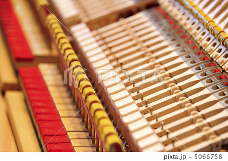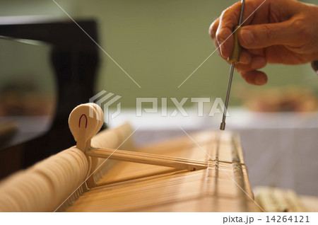 Close-up of detail of a Celtic natural wood finish harp neck and bridge with tuning pins and strings