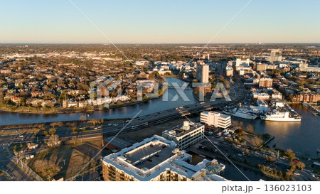 Aerial view of Norfolk Virginia downtown waterfront and urban harbor