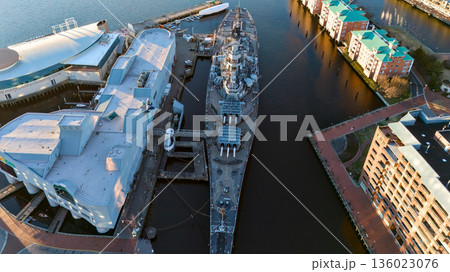 Aerial view of Norfolk Virginia waterfront with naval ship and marina
