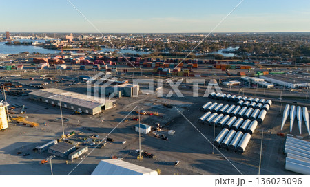 Aerial view of wind turbine towers loaded at port with heavy cranes