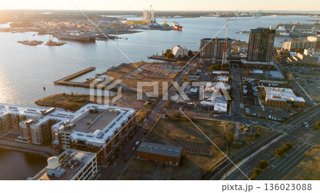 Aerial view of Norfolk Virginia waterfront with port area and bay