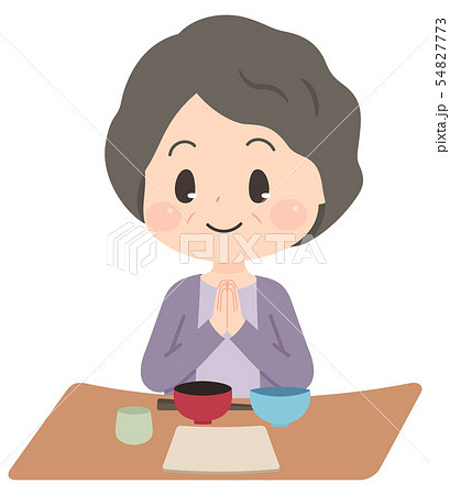 面向前方。一位身穿開襟羊毛衫的老婦人雙手合十,說道「itadakimasu」(謝謝款待)。