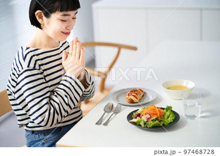 在家裡的餐廳開始用餐的女人