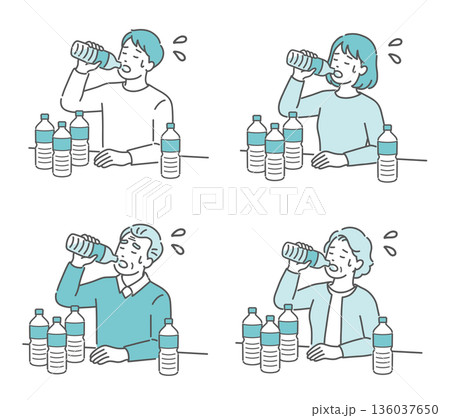 一組插圖,描繪了口渴並喝水的男性、女性和老年人(糖尿病、過度飲水、口乾、中暑)。