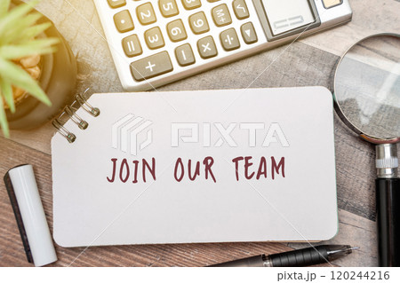 Notebook with word Join our team. Invitation for individuals to become part of an organization or group. Prospective employees to apply for open positions. Business concept