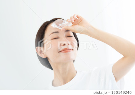 特寫鏡頭:一位半透明的女人用冰塊冷卻她的皮膚
