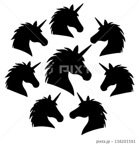 Eight majestic unicorn head silhouettes arranged in circular pattern fantasy creature art