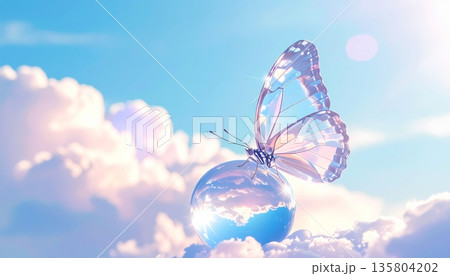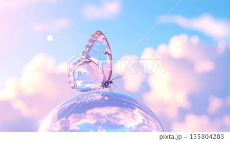 Transparent Crystal Butterfly on Crystal Bubble with Pastel Blue Sky