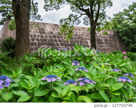 六月的皇居東御苑:天守閣石牆與繡球花